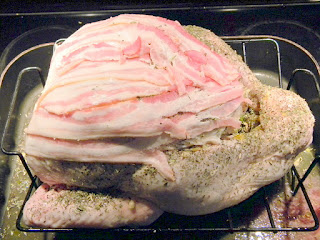 Place 6-8 pieces of bacon over the breast. This will also help keep the white meat moist.